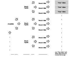 The second diagram indicates the problem with a tree topology. If one member cannot be reached, the message doesn't make it to his entire branch. However, the third diagram indicates a way to work around that problem, by having a few links that connect different branches so that if the chain is broken at one member, his downline may still receive the alert.